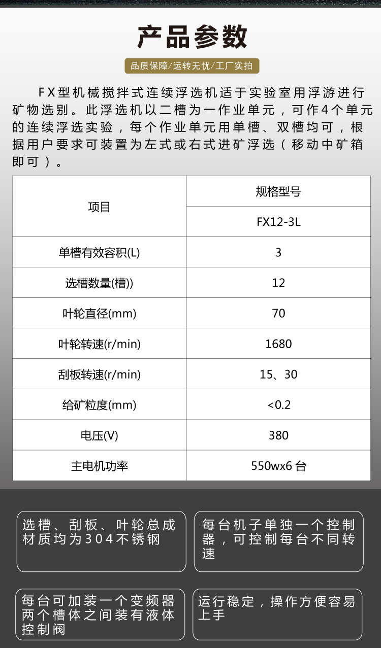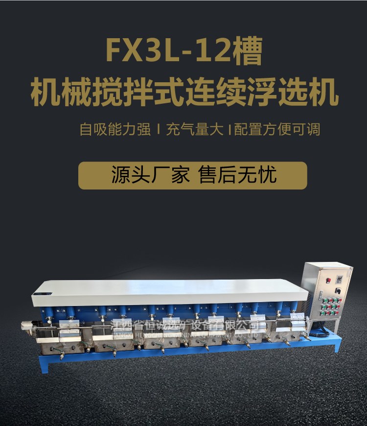FX型机械搅拌式连续浮选机适于实验室用浮游进行矿物选别。此浮选机以二槽为一作业单元,可作4个单元的连续浮选实验,每个作业单元用单槽、双槽均可,根据用户要求可装置为左式或右式进矿浮选(移动中矿箱即可)。