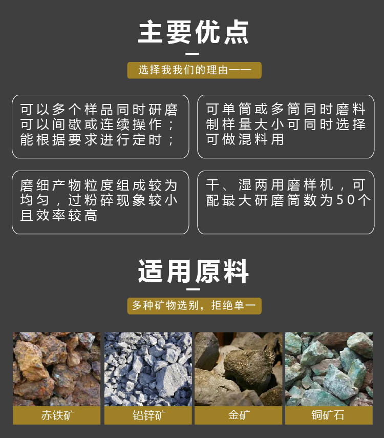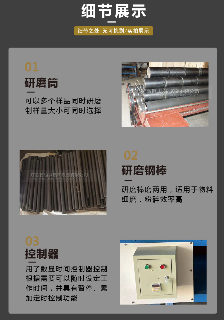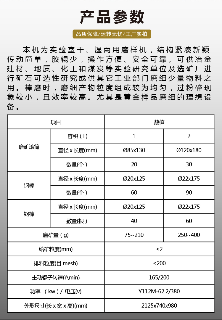 可供冶金建材、地质、化工和煤炭等实验研究单位及选矿厂进行矿石可选性研究或供其它工业部门磨细少量物料之用。棒磨时,磨细产物粒度组成较为均匀,过粉碎现象较小,且效率较高。尤其是黄金样品磨细的理想设备。