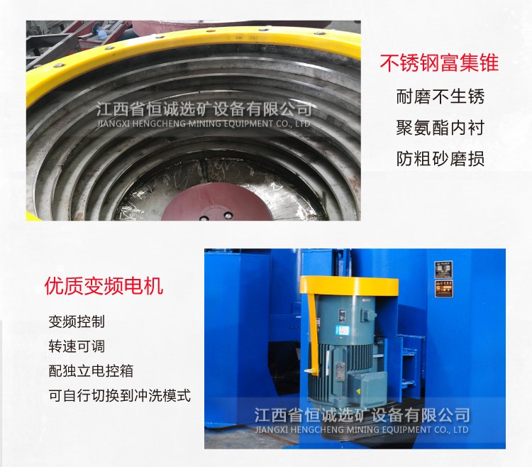 水套式离心选矿机是目前最新的一种重力选矿设备,该设备的原理是利用离心力来扩大矿物颗粒的重力来使重颗粒和轻颗粒分离。其关键的部件是一个锥形的富集锥,它由电机带动高速旋转并由加压的反冲水包围。进入离心机