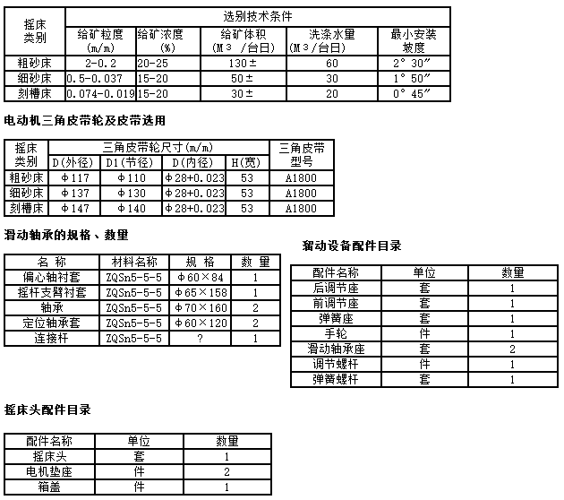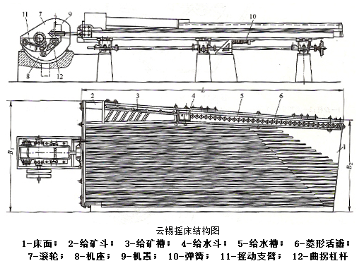 云锡摇床主要由床面、床头、溜动设备三大部分组成。床面由床架部分和给矿槽等部分组成。床面分有粗砂床面和刻槽床面。根据选矿粒度和浓度的不同选择适当的床面(附表)。床面支撑在溜动设备上,由床头的床面挂钩连接床面,在床头的推动下使床面往复运动进行选矿。 床头系采用偏心轴带动偏心滚轮来推动摇杆支臂,例摇杆支臂叉推动联接丁头螺杆,因而使螺杆往复运动。床头润滑轴承系采用ZQSN5-5-5材料作为滑动轴承,具有噪音小转动灵活等特点。 溜动设备部分主要是用来调节选矿设备所需要坡度,利用手轮调节斜度托板,使床面产生坡度。