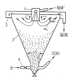 1-给矿管; 2-环形溢流槽;3-锥体; 4-备用高压水管