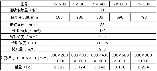 水力分级箱是一铁制的角锥箱,上部安有楔形阻砂条,下面装有分级箱底阀。通常由从200毫米到800毫米一系列宽度的分级箱用普通水槽联结而成,沉砂则由粗到细排出。
