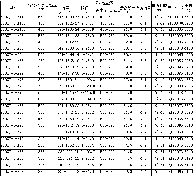 ZJ系列渣浆泵型号意义举例: 200ZJ-I-A70 200泵出口直径(MM)   ZJ   渣浆泵    I(II)为一级泵或单级泵(II)为二级泵)  A 叶轮叶片数目