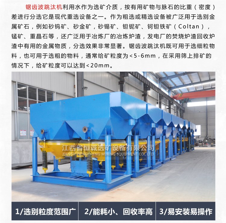 锯齿波跳汰机是我厂与科研单位合作开发的节能高效新产品,它是重力选矿的关键设备。由于它处理能力大,选别粒度范围广,回收率高,效果好,故广泛应用于选别砂金、锡、钨、铅、锌、锑、锰、金刚石、铁矿等有色冶金矿山和采金船上。