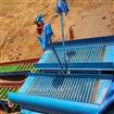 溜槽淘金是利用金与沙子比重的差别进行分选的一款矿物重选设备,其工作原理是:矿浆流经溜槽,比重大的金沉淀于底层,沙子等比重小的浮于_上层随水流排出工作区。 原先的固定式溜槽是用淘金毡提金,由于溜槽板结、淤槽等现象,淘金毡提金的净选率较低这些缺点,鼓动式溜槽有针对性的进行了克服--它的底板用橡胶板制成,利用机械鼓动底板,使底板缓慢鼓动,克服泥沙板结,周期性鼓动,完成分层和排沙,从而使得净选率提高。 经过多年的改进和对比试验,鼓动式淘金溜槽以其结构简单、工作可靠、净选率高等优点,近年来和淘金水套离心机等成为淘金机械中的主流之选。