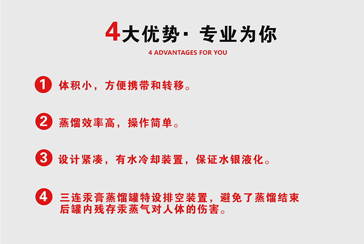 汞膏蒸馏罐优势: 1、体积小,方便携带和转移。 2、蒸馏效率高,操作简单。 3、设计紧凑,特有水冷却装置,保证水银彻底液化。 4、三连汞膏蒸馏罐特设排空装置,避免了蒸馏结束后罐内残存汞蒸气对人体的伤害。