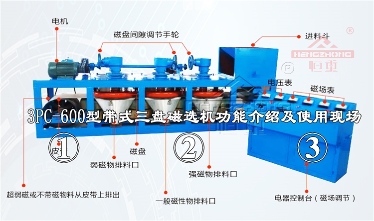三盘磁选机为电磁,磁场强度可调。通过调整电流大小,来控制磁场,最高可达23000高斯。