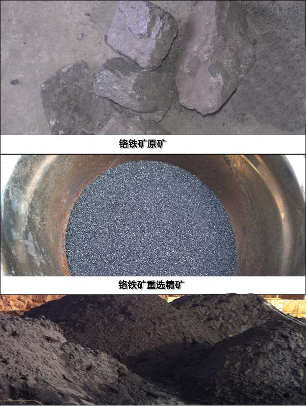下面是一组铬铁矿图片,上图为铬铁矿原矿,下图为铬铁矿重选精矿。