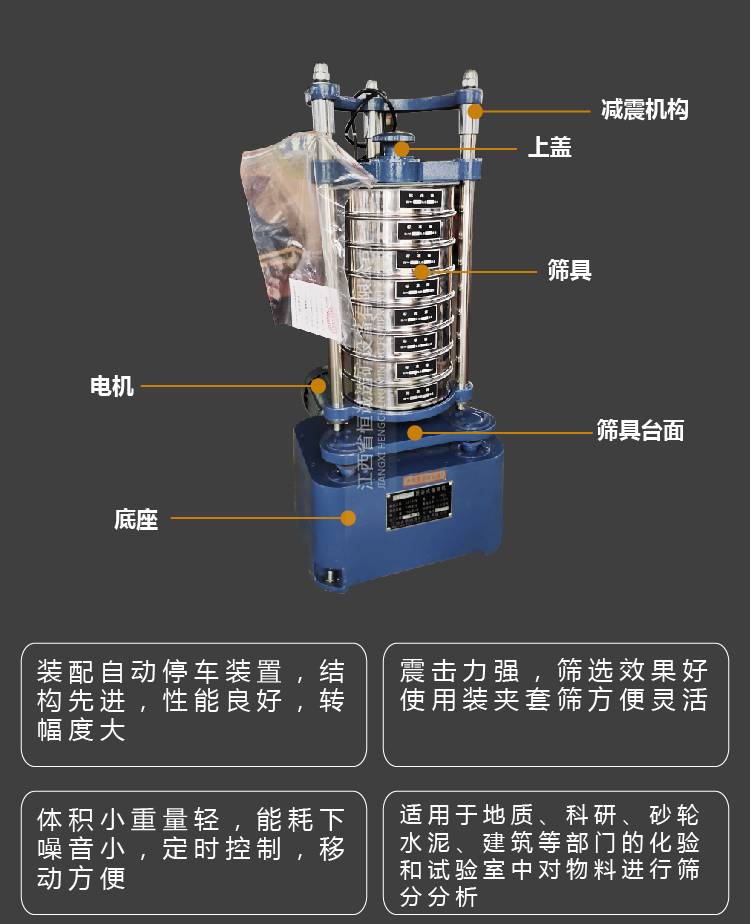 200型试验筛是以振动电机作为振动源的,振动电机振动带动筛机底座振动,再通过底座传导到安放在底座上的标准试验筛,标准检验筛上,使小于试验筛筛面网孔的物料颗粒筛分进下层试验筛,如此层层筛选,使每层试验筛内只留相同粒度的物料。达到不同粒度的分离并确定此物料的粒度组成。
