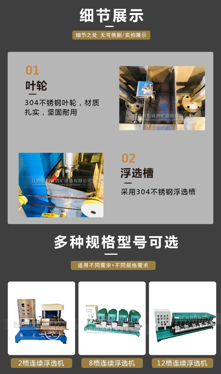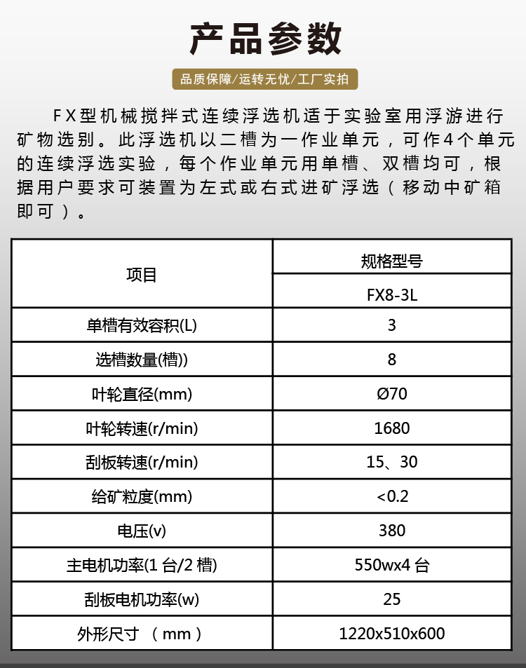 产品概况:FX型机械搅拌连续式浮选机主要供煤电、电力、矿山、地质、化学、冶金、建材及化工等工业实验浮选少量矿样用。由于它可以组成一个串连组,并且可连续式工作,所以它比普通单槽浮选机处理矿样更