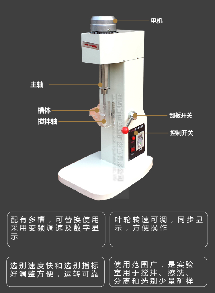 产品概况:XFG浮选机主要供煤电、电力、矿山、地质、化学、冶金、矿山选厂及院校科研单位试验室搅拌、分离、擦洗、精选矿样等,该机浮选速度快和选别指标好,调整方便准确,运转可靠,可对原矿品位低的矿