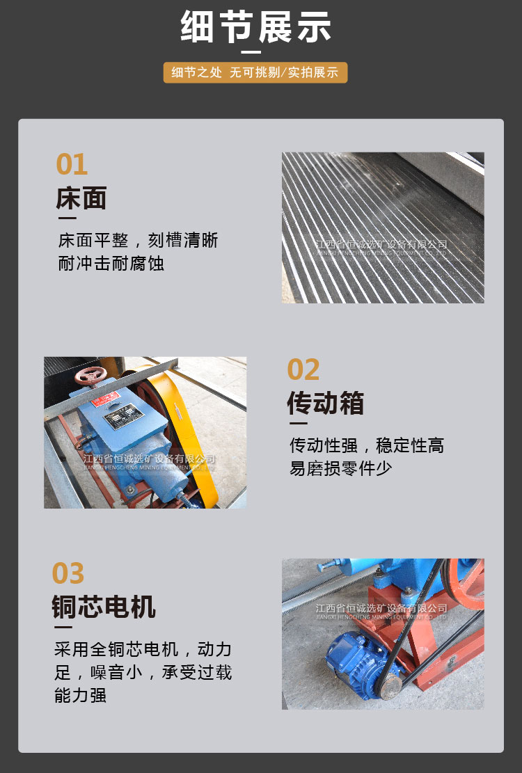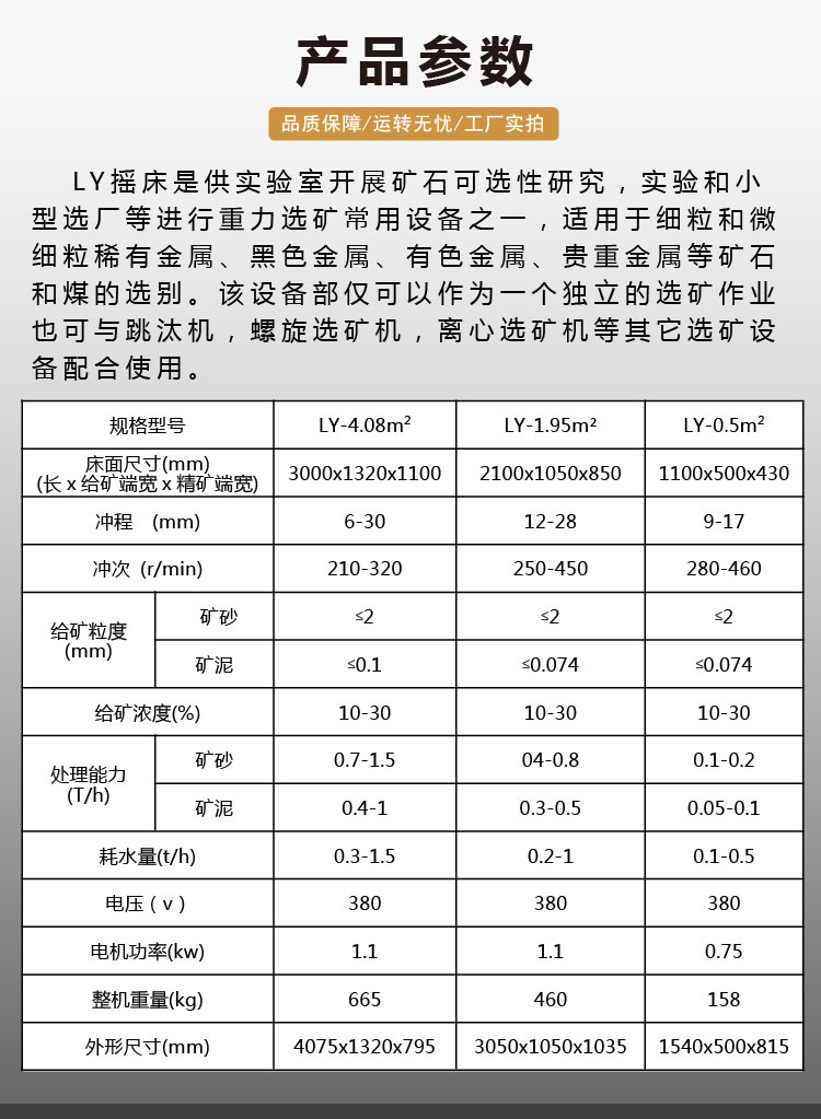 LY-0.5平方摇床概况:LY摇床是供实验室开展矿石可选性研究,实验和小型选厂等进行重力选矿常用设备之一,适用于细粒和微细粒稀有金属、黑色金属、有色金属、贵重金属等矿石和煤的选别。该设备部仅可以作
