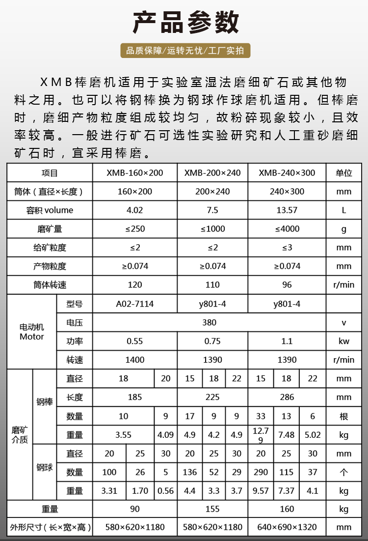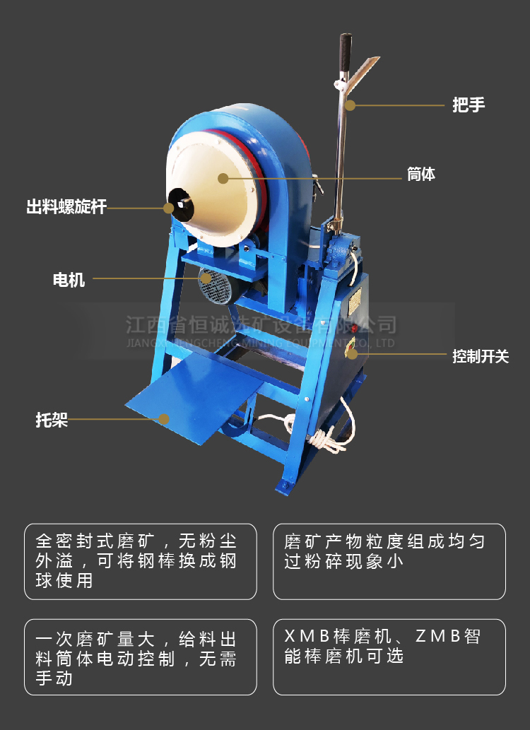 产品概况:XMB系列棒磨机(原型号:XMB-68型、XMB-67型),适用于实验室湿法磨细矿石或其他物料之用。也可以将钢棒换为钢球使用。但棒磨时,磨细产物粒度组成较均匀,过粉碎现象较小,且效率