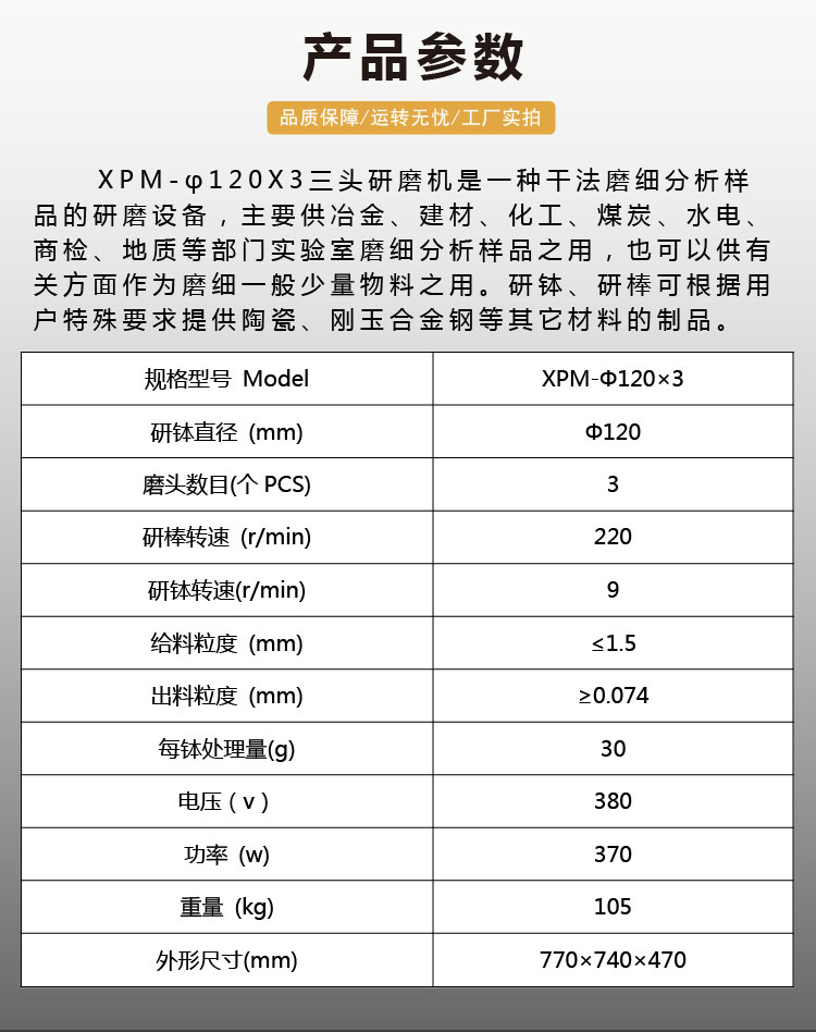 产品概况:XPMФ120×3三头研磨机是一种干法磨细、分析样品的研磨设备,主要供冶金、建材、化工、煤炭、水电、商检、地质等部门实验室研磨分析样品之用,也可供有关方面作为磨细一般少量物料之用。(标