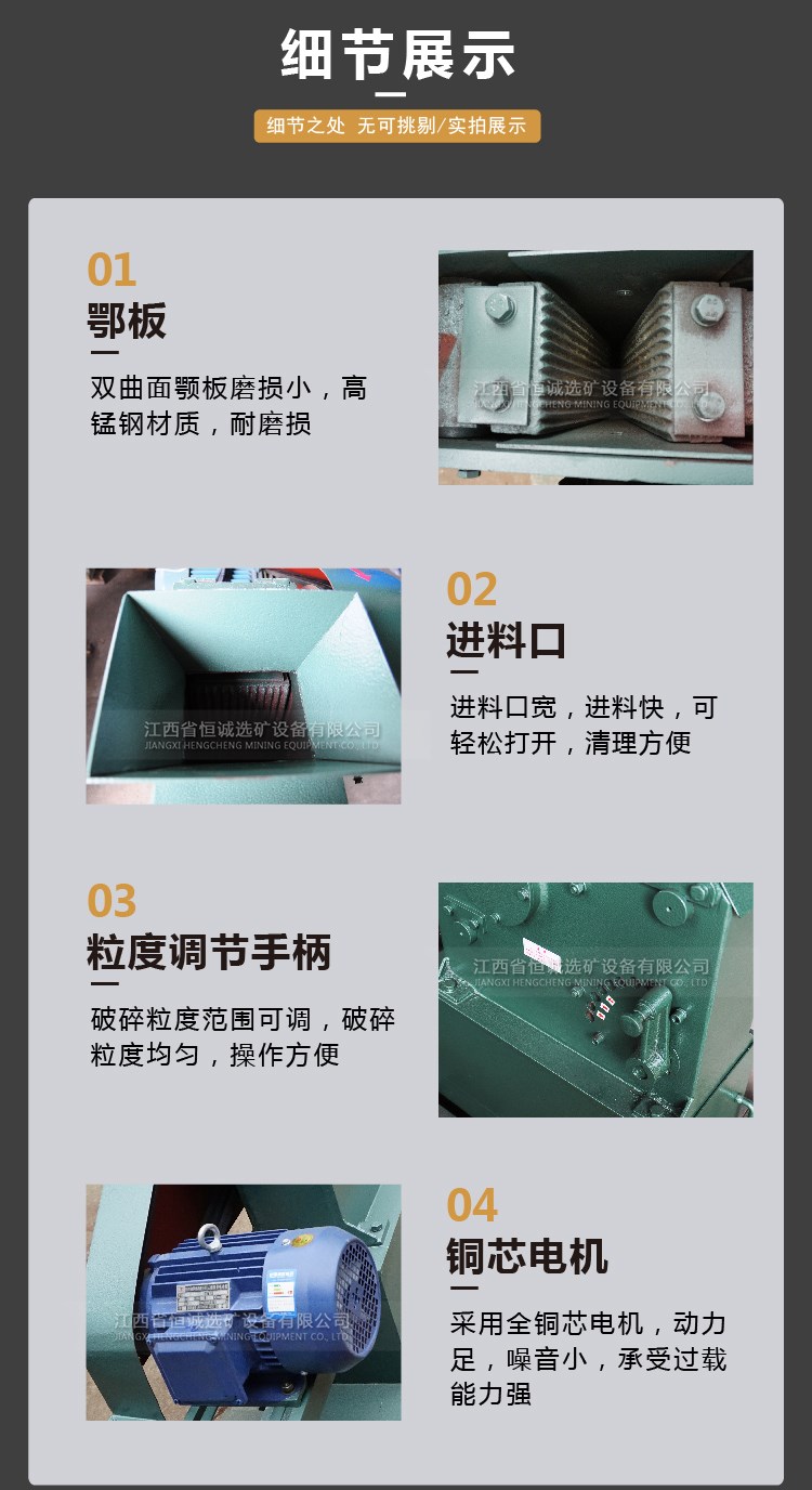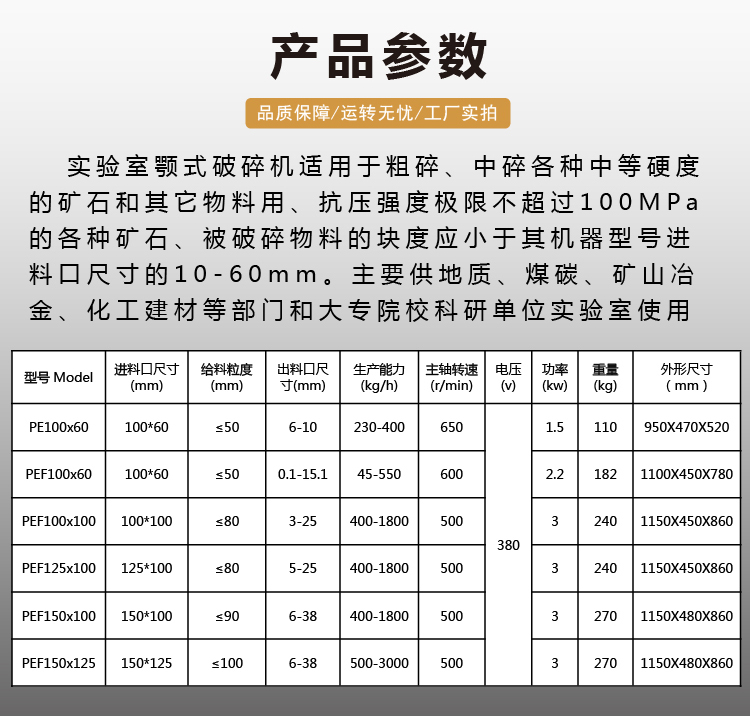 实验颚式破碎概况:密封式颚式破碎机系列产品:该机工作时,电动机驱动皮带和皮带轮通过偏心轴使动颚上下运动,当动颚上升时肘板和动鄂间夹角变大,从而推动动颚板向定颚板接近,与此同时物料被挤压、搓、碾等多重破碎;当动颚下行时,肘板和动颚板间夹角变小,动颚在拉杆、弹簧的作用下离开定颚板