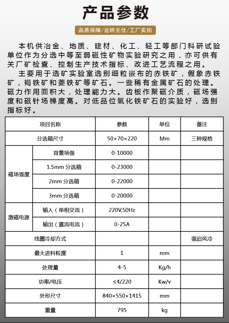 本机供冶金、地质、建材、化工、轻工等部门科研试验单位作为分选中等至弱磁性矿物实验研究之用,亦可供有关厂矿检查、控制生产技术指标、改进工艺流程之用。