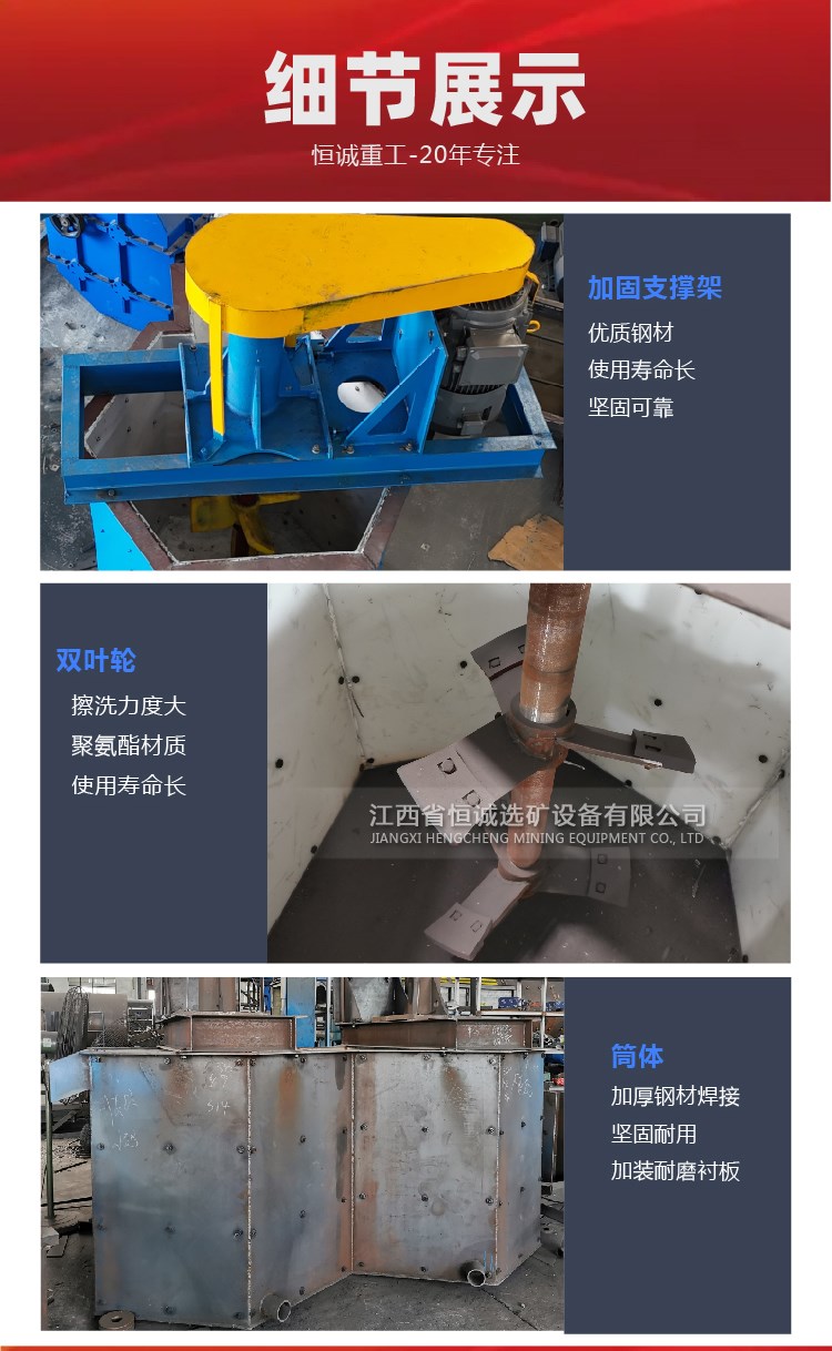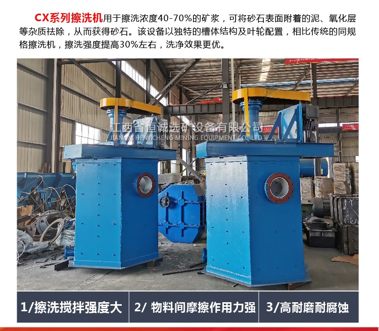 CX系列擦洗机用于擦洗浓度40-70%的矿浆,可将砂石表面附着的泥、氧化层等杂质祛除,从而获得砂石。该设备以独特的槽体结构及叶轮配置,相比传统的同规格擦洗机,擦洗强度提高30%左右,洗净效果更优。