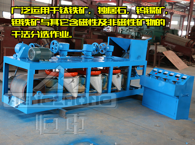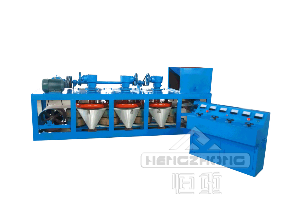 三盘带式磁选机用于分选选小于2-3mm的弱磁性矿物和稀有金属矿石的精选,是一种很重要的选矿设备。三盘带式磁选机分CP-500,CP-600两种机型。干式三盘强磁选机适用于多种磁性矿物混合矿的分选,根据矿物的磁性差异,可通过调节各级磁盘励磁电流形成不同强度的磁场来对矿物进行高效分离,也可调节各级磁盘与被选矿粒之间的感应距离来得到不同的磁场感应强度