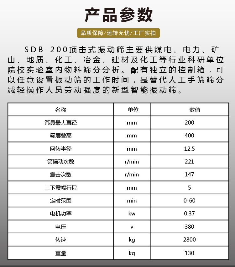 SDB-200顶击式振动筛主要供煤电、电力、矿山、地质、化工、冶金、建材及化工等行业科研单位、院校实验室内物料筛分分析。配有独立的控制箱,可以任意设置振动筛的工作时间,是替代人工手筛筛分、减轻操作人员劳动强度的新型智能振动筛。
