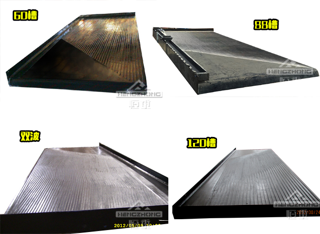 我厂主要生产的床面规格有:46槽摇床面(属粗砂摇床面)、50槽摇床面(属粗砂摇床面)、60槽摇床面(属细砂摇床面)、88槽摇床面(属细砂摇床面)、110槽摇床面(属砂泥摇床面)、120槽摇床面(属砂泥摇床面)、135槽摇床面(特细泥摇床面),单波摇床面、双波摇床面(用于分选砂金),台浮摇床面;材质分为:木刻槽、玻璃钢、橡胶、漆灰刻槽(主要以玻璃钢为主,原因如下:)。