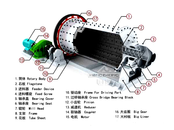 本机为卧式筒形旋转装置,外沿齿轮传动,两仓,格子型球磨机。物料由进料装置经入料中空轴螺旋均匀地进入磨机第一仓,该仓内有阶梯衬板或波纹衬板,内装不同规格钢球,筒体转动产生离心力将钢球带到一定高度后落下,对物料产生重击和研磨作用。物料在第一仓达到粗磨后,经单层隔仓板进入第二仓,该仓内镶有平衬板,内有钢球,将物料进一步研磨。粉状物通过卸料箅板排出。