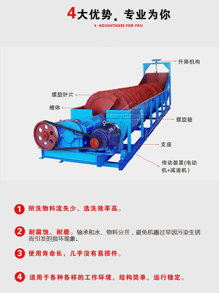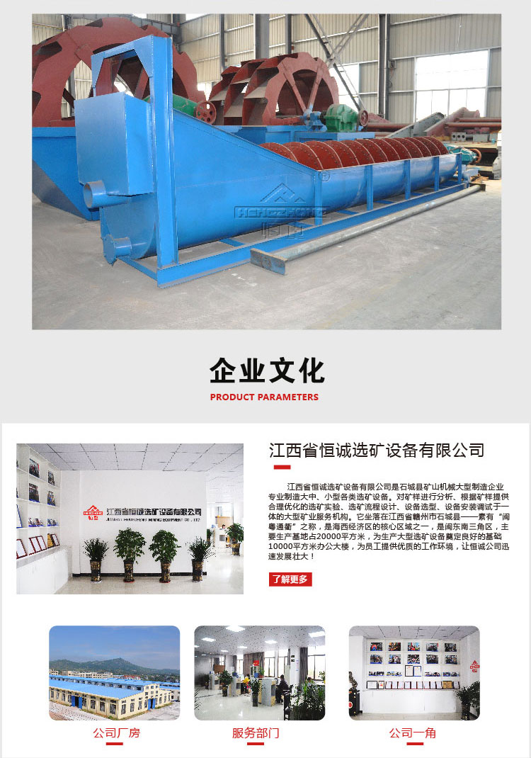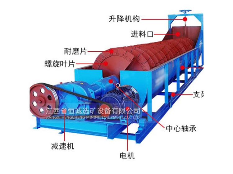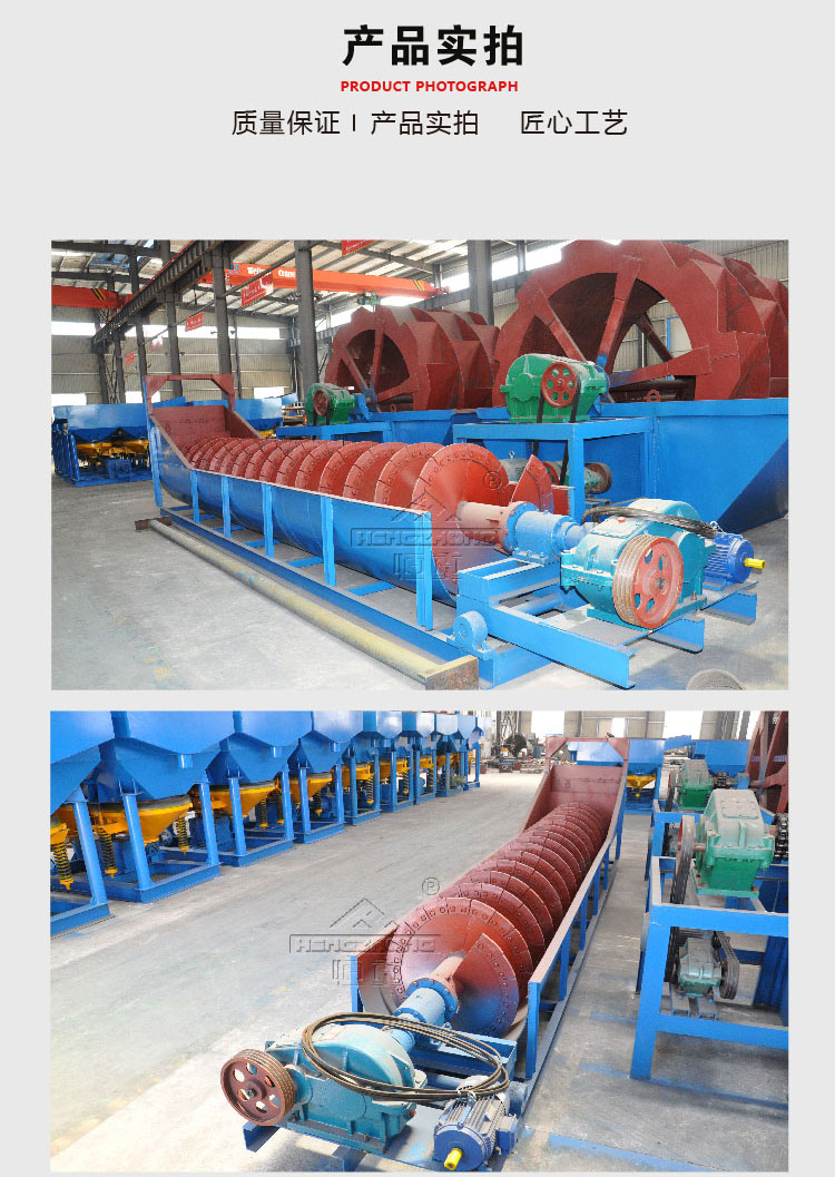 螺旋槽式洗砂机适用於黑色和有色冶金矿山等预选矿石、将矿石用水洗选,以除去原矿中的泥砂等杂质,从而使矿石达到工艺和经济上的要求,广泛用于锰矿脱泥粗选和精选,特别对埋於泥土中的颗粒锰矿石效果最佳。它的处理能力较大是满足大生产力对矿石、石料的清洁度有要求的企业的理想设备。