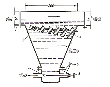 1-矿浆溜槽;2-分级箱;3-阻砂条;4-砂芯(塞);5-手轮;6-阀门