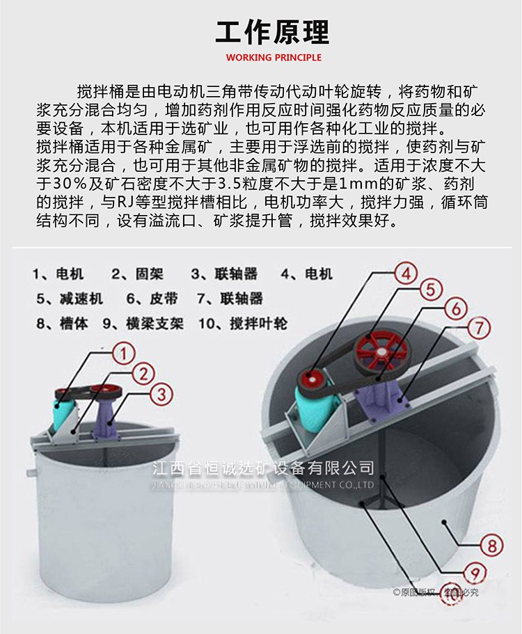 搅拌桶用于浮选作业前的矿浆搅拌,是药剂与矿浆充分混合,为选矿作业创造条件。也可将火力发电厂电除尘器、省煤器、空气预热器等灰斗下部储灰斗中的煤灰在桶内加水进行高浓度的搅拌。浓度由加入的水量调节,搅拌