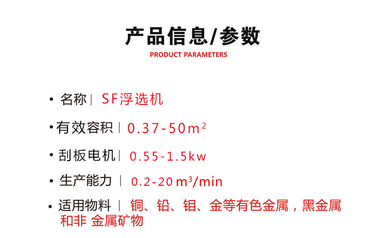 产品概况:SF浮选机用于分离有色金属、黑色金属、贵金属、非金属矿物和化工原料、回收有用矿物;还可用于非金属如:煤莹石、滑石的选别。该设备具有如下特点:吸气量大、功耗低。每槽兼有吸气、吸浆和浮选三