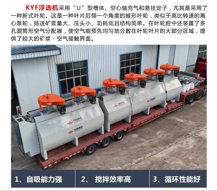 KYF浮选机采用“U”型槽体、空心轴充气和悬挂定子,尤其是采用了一种新式叶轮。这是一种叶片后倾一个角度的锥形叶轮,类似于高比转速的离心泵轮,扬送矿浆量大、压头小、功耗低且结构简单。在叶轮腔中还装置了多孔圆筒形空气分配器,使空气能预先均匀地分散在叶轮叶片的大部分区域,提供了较大的矿浆-空气接触界面。