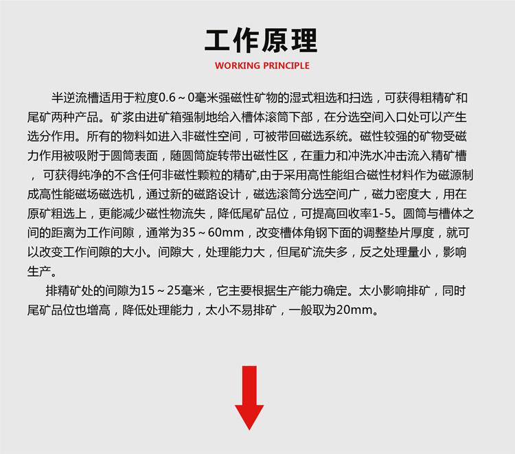 物料在湿式磁选机中的分选过程大致为:浆体经过给料箱进入磁选机槽体以后,在喷水管喷出水(也称吹散水)的作用下,呈松散状态进入给料区;磁性颗粒在磁场力作用下,被吸在圆筒的表面上,随圆筒一起向上移动;在移动过程中,由于磁系的极性交替,使得磁性颗粒成链地进行翻动(称为磁翻或磁搅拌)