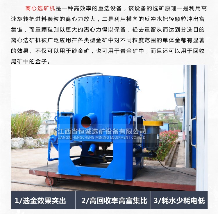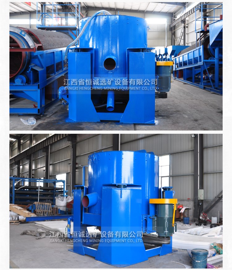 离心选金机是目前最新的一种重力选矿设备,该设备的原理是利用离心力来扩大矿物颗粒的重力来使重颗粒和轻颗粒分离。其关键的部件是一个锥形的富集锥,它由电机带动高速旋转并由加压的反冲水包围。进入离心机