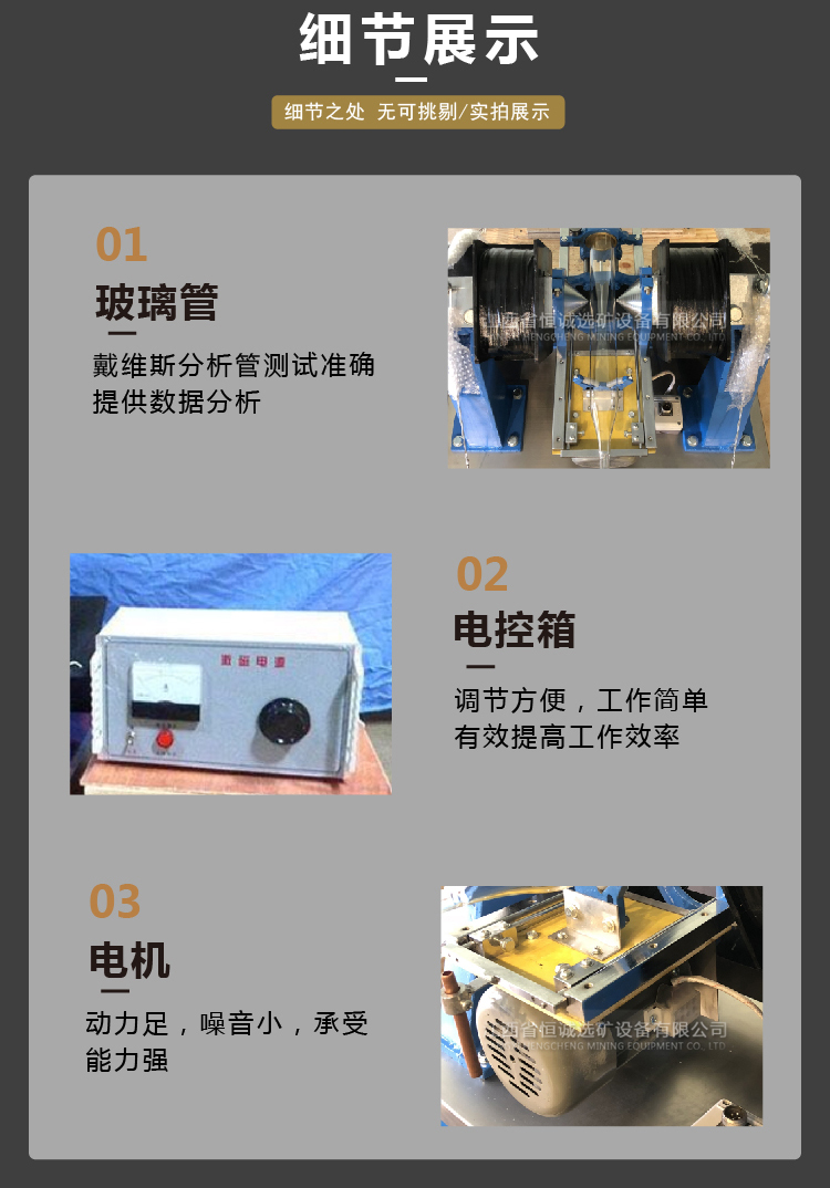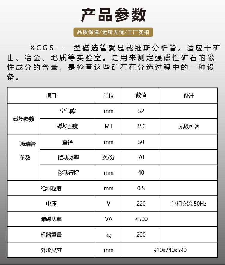 产品概况:XCGS磁选管又名戴维斯分析管,用于矿山,冶金,地质等实验室。是选矿过程中,用来测定磁性矿石中磁性成分的一种设备。本产品由原地矿部唯一指定企业生产,执行行业标准。XCGS磁选管式在C