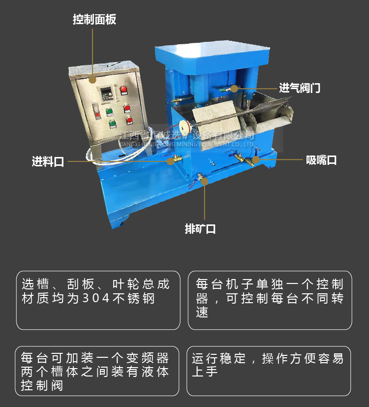 产品概况:FX型机械搅拌连续式浮选机主要供煤电、电力、矿山、地质、化学、冶金、建材及化工等工业实验浮选少量矿样用。由于它可以组成一个串连组,并且可连续式工作,所以它比普通单槽浮选机处理矿样更