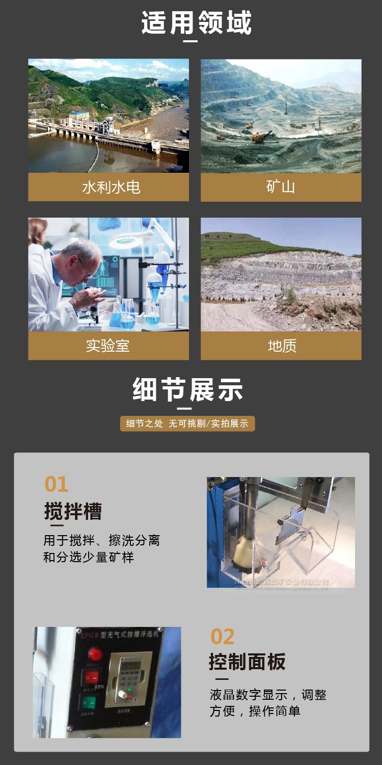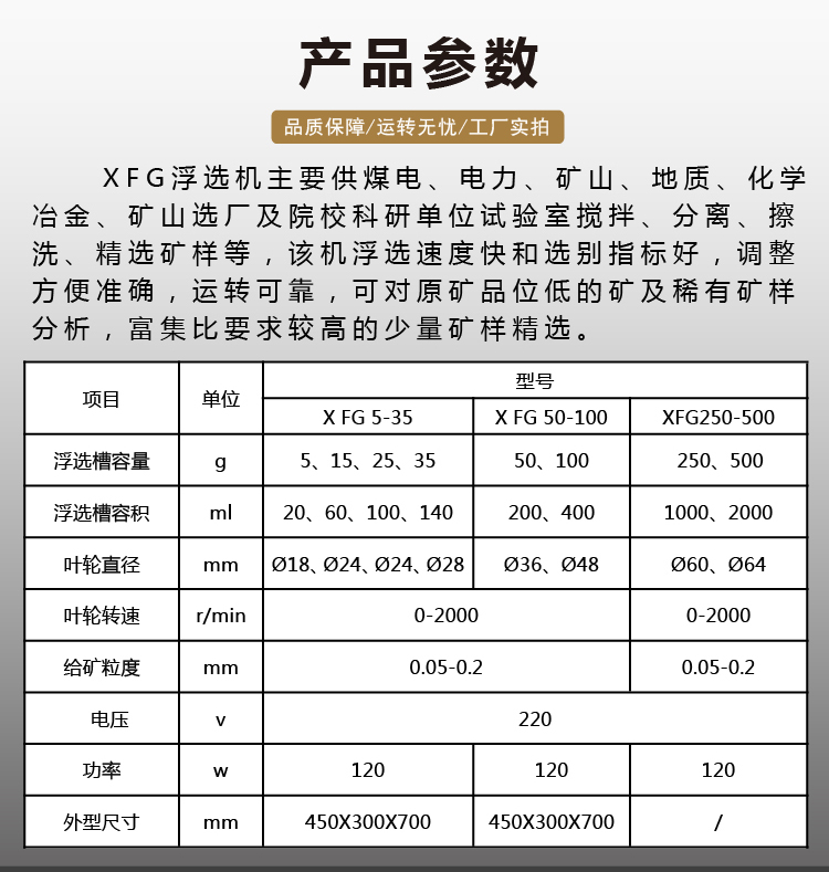 产品概况:XFG浮选机主要供煤电、电力、矿山、地质、化学、冶金、矿山选厂及院校科研单位试验室搅拌、分离、擦洗、精选矿样等,该机浮选速度快和选别指标好,调整方便准确,运转可靠,可对原矿品位低的矿