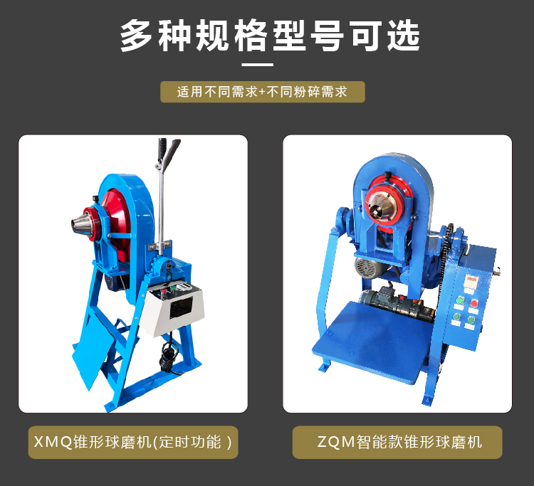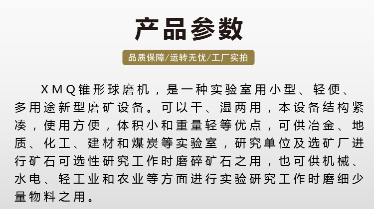 产品概况:XMQ锥形球磨机用于实验室干法、湿法磨细矿石,广泛地用于冶金、建材、化工、煤炭、水电、农业和地质实验工作中的人工重砂、技术加工等磨细物料,另与三辊多筒棒磨机配套使用,广泛用于金刚石行业;